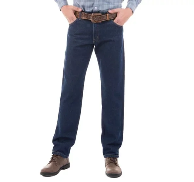 CCalça Wrangler masculina Cowboy Cut modelo Regular Fit, fabricada em tecido Jeans Amaciado (azul tradicional) 100% Algodão cor Amaciado, cintura no lugar e rebites personalizados e etiqueta no bolso de couro costurada com o logo wrangler.