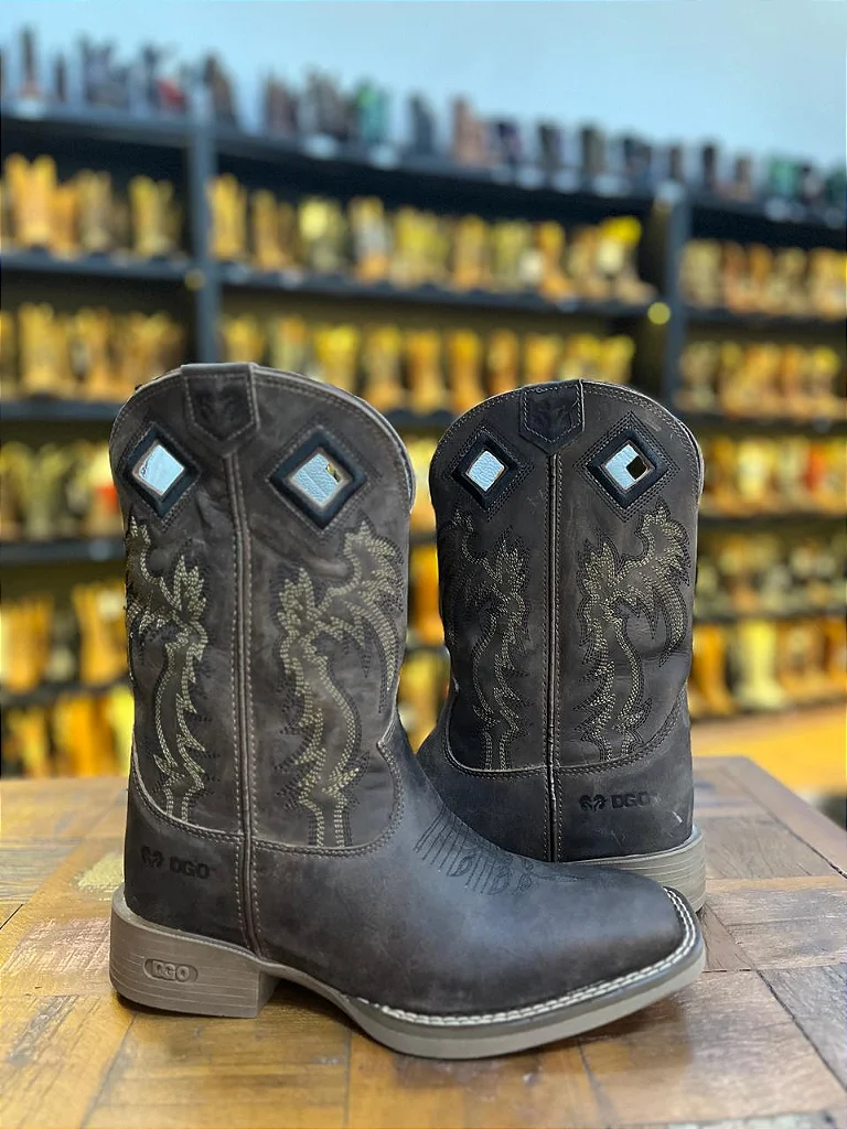 Pé fabricado em couro bovino legítimo, na cor Med Dog, bico quadrado, com florão bordado no peito do pé.