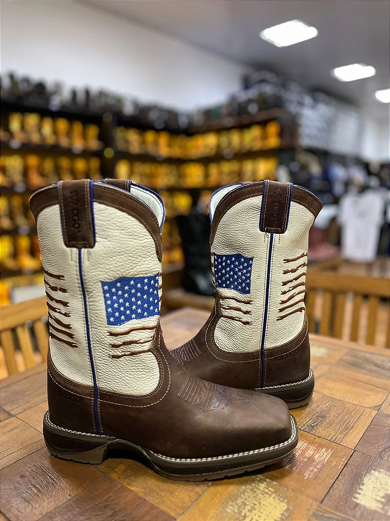 Cano fabricado em couro bonivo, com bordados bandeira EUA nas cores Azul e Marrom. Forrada internamente em couro. Puxador nas laterais com detalhe Azul.