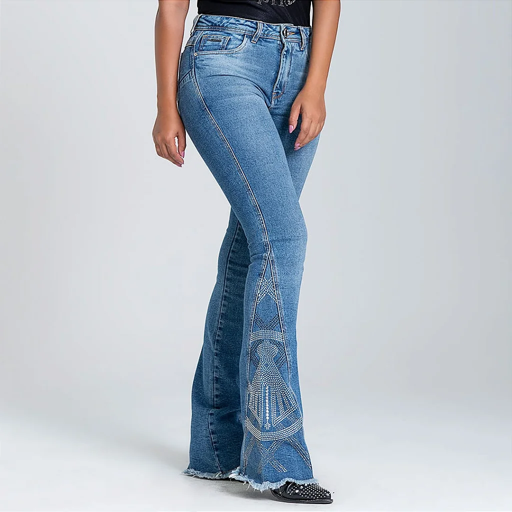 Modelagem Flare, cós médio, com aplique em strass, e bordado em alta definição em formato de nossa senhora aparecida.