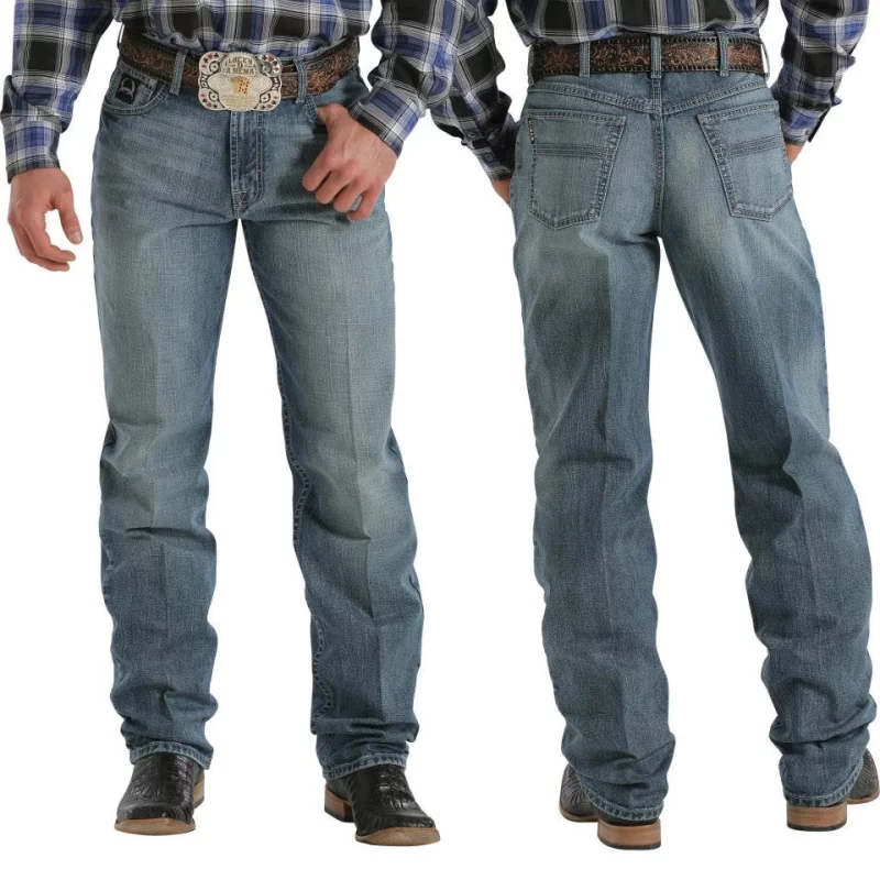 Calça Cinch® importada masculina modelo Black Label 2.0 Relaxed Fit, fabricada em tecido Jeans 100% Algodão de alta qualidade, cintura no lugar, detalhes em rebites e botão personalizados. O aumento médio é padrão para este jeans tradicional ocidental. A coxa relaxed combinada com uma abertura inferior ligeiramente cônico cria um jeans para o homem ocidental memorável. Fino acabamento.